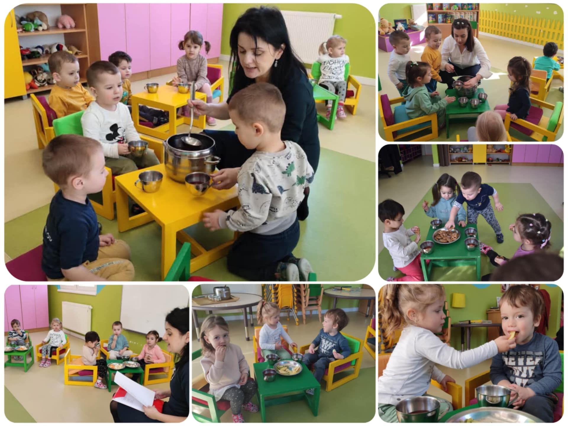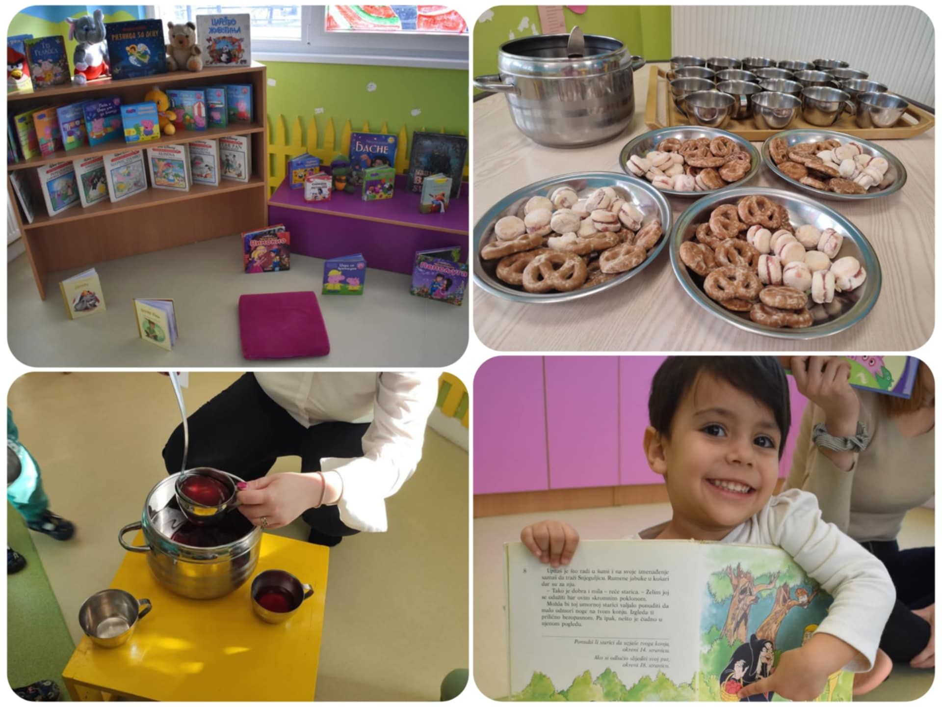 U svakoj sedmici, jedna od mama je čitala bajke na radost naših mališana. Bajke su bile pažljivo odabrane kako bi podstakle maštu djece i razvile njihovu ljubav prema knjigama. Posle svake pročitane bajke, organizovano je druženje uz čaj i čajne keksiće, što je djeci pružilo priliku da se opuste i podijele svoja razmišljanja o pročitanim pričama. Bajke koje su djeca slušala su: ,,Tri praseta’’, ,,Vuk i sedam jarića’’, ,,Palčić’’, ,,Crvenkapa’’. Posle pročitanih bajki i čajnog posluženja i degustacije, djeca su zajedno sa mamom koja je došla taj dan igrala njihove omiljene pokretne igre, kao što su: ,,Medo miško'', ,,Sklupčao se mali jež'', ,,Kad si srećan'' i sl.