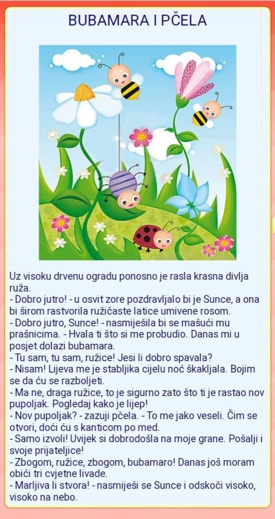 Vaspitač pomaže djeci da sjednu u formaciju polukruga i zajedno sa njima sjeda na pod. Pokazuje im igračku bubamare i pčele , govori im da pažljivo slušaju jer će da čuju priču o jednoj bubamari i pčelici (prilog broj 1). Priču vaspitač čita izražajno, jasno, glasno uz mijenjanje intonacije i malo glume. Tokom čitanja priče vaspitač djeci pokazuje slike iz priče. Nakon pročitane priče vaspitač djeci daje igračke kako bi ih imenovali, uočili po čemu se razlikuju I da se igraju sa njima.