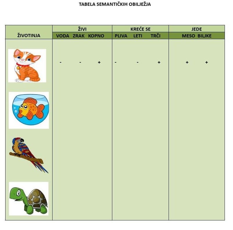 Sada ćemo se zajedno prisjetiti svega onoga što znate o kućnim ljubimcima. Na tabeli su prikazana neka obilježja životinja koja se odnose na mjesto življenja, način kretanja i vrstu ishrane određene životinje. Za sva obilježja za koja ste sigurni da se odnose na određenog kućnog ljubimca upisat ćemo znak (+), za svako obilježje koje se ne odnosi na kućnog ljubimca upisat ćemo znak (-), a ukoliko niste sigurni da li se neko obilježje odnosi na tu životinju upisujemo (?). Ukoliko niste sigurni u određeni odgovor slobodno možete i nagađati. Slijedi popunjavanje tabele Prilog 2. Tabela sematičkih obilježja.