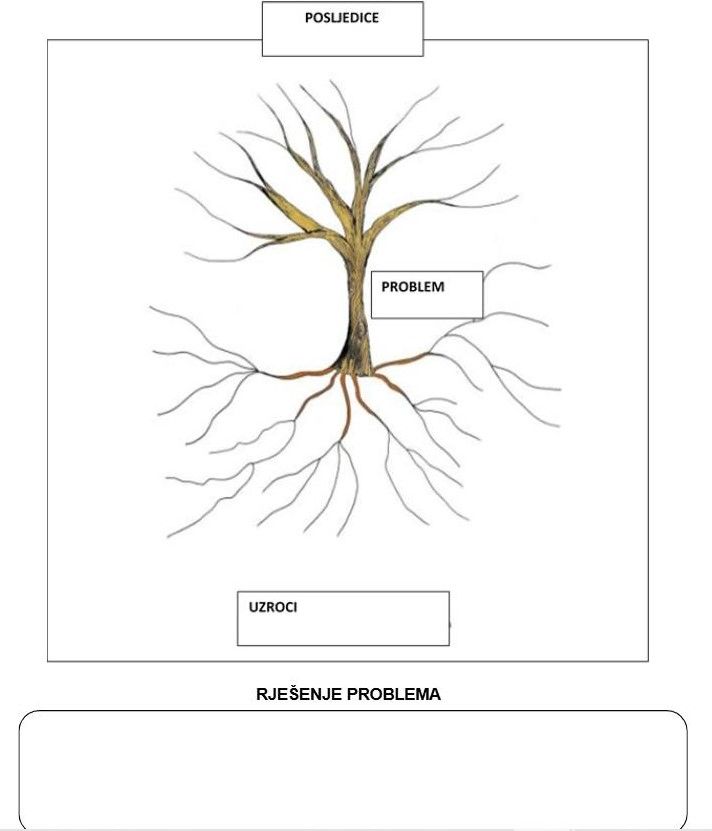 Učenici se iz forme velike grupe, vraćaju u svoje matične grupe. Zadatak koji slijedi je tehnika Drvo problema (Prilog 3.) kroz koju će učenici primjeniti naučeno.