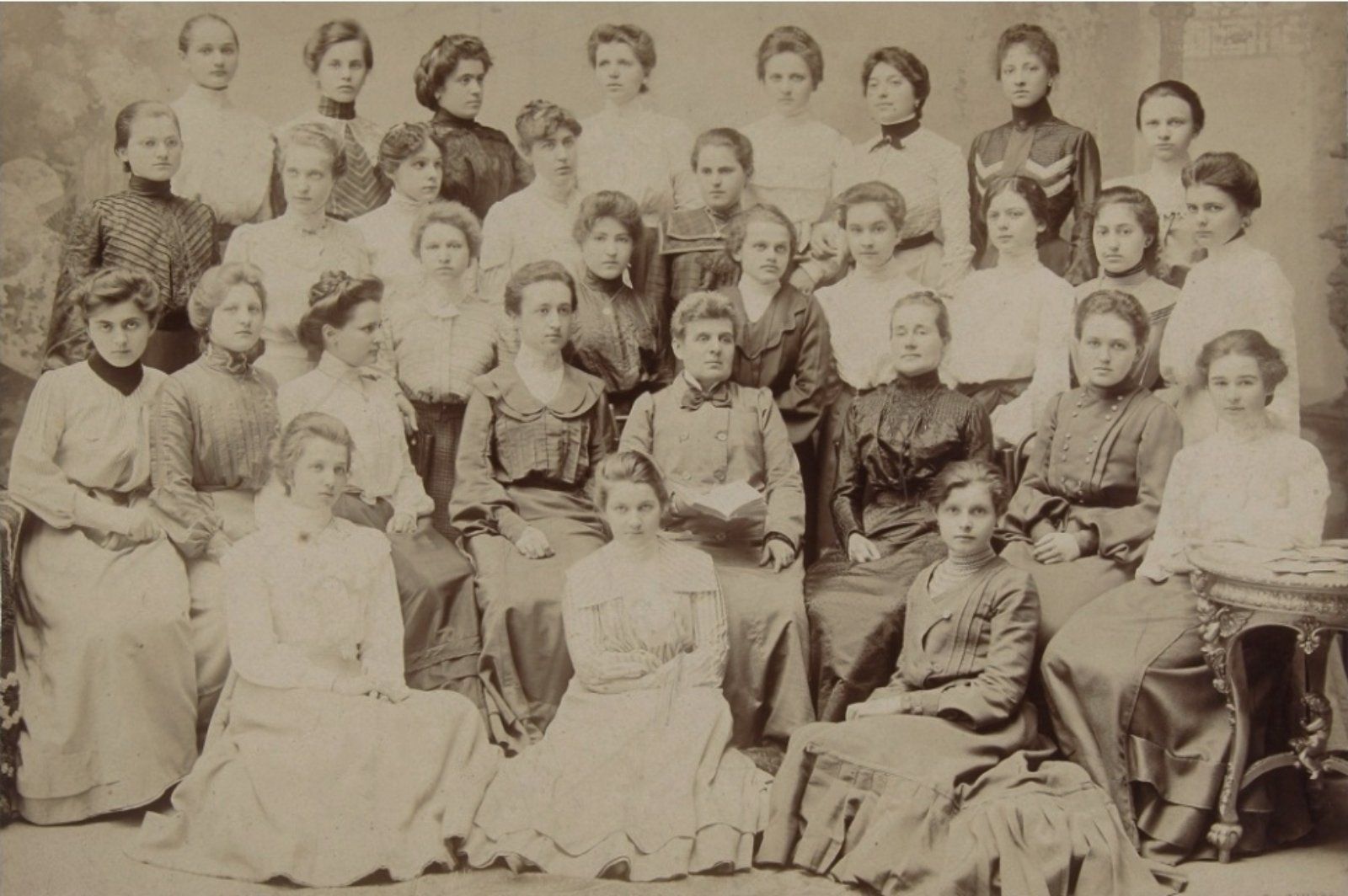 Foto: G i I. Varga. Maturantice liceja s učiteljicama Marijom Horvat i Marijom Jambrišak, 1902.-1903. (izvor: Hrvatski školski muzej)