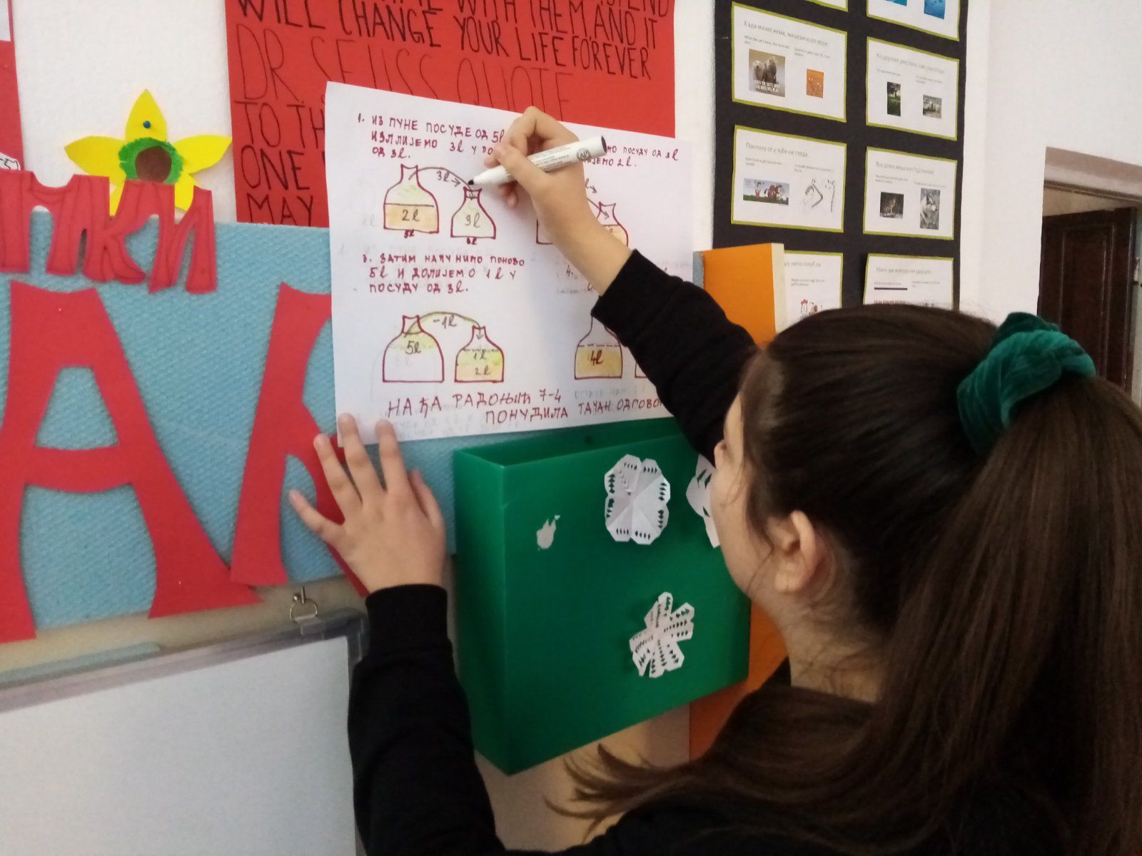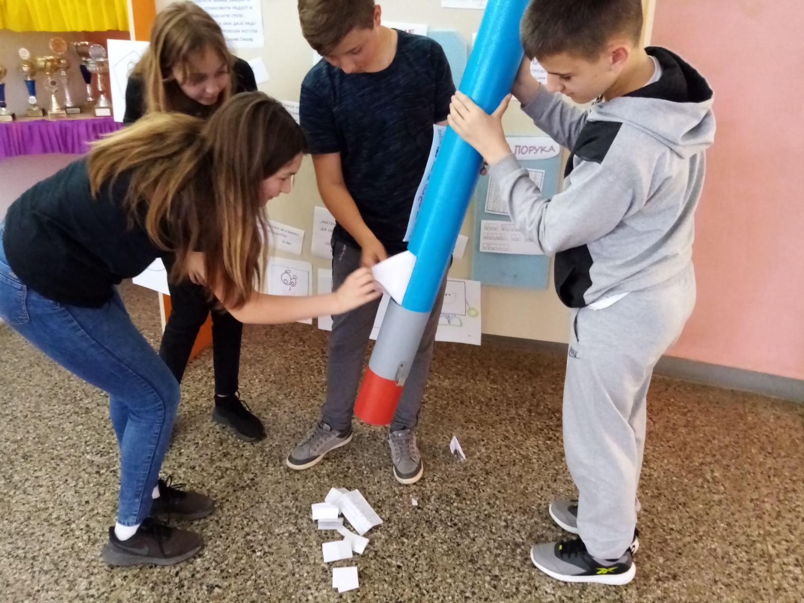 •   Na tabli koja se nalazi postavljena u holu škole  ponedjeljkom  se  postavljaju zadaci (mozgalice, matematičke zagonetke, šifrovane poruke), koje  učenici rješavaju i rješenja na papirima ubacuju u model olovke koju smo nazvali "SVEZNALICA". Petkom se postavljaju  i čitaju rješenja učenika.