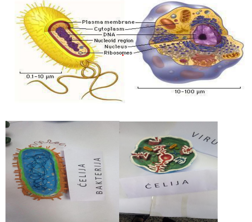 PRILOG 1. MODEL ĆELIJA ( prokariotska i eukariotska) – Na osnovu radnog lista, na kojem se nalazi slika ćelija učenici su napravili modele sa jasno prikazanom ćelijskom opnom, citoplazmom (organelama) i jedro. Pomoću materijala učenici su oblikovali date elemente kao na slici, obojil i prelakirakli.