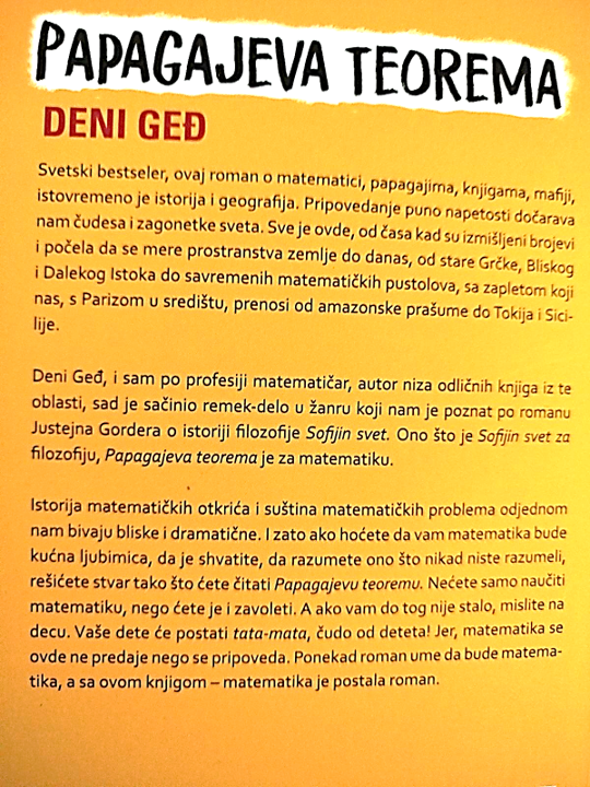 - Ova knjiga je jedno posebno štivo, podjednako zabavno i poučno.„Papagajeva teorema“ je sjajan izbor i za školski čas jer pruža mnogo prostora za povezivanje književnosti, istorije i matematike. Kako je Tales otkrio svog saveznika i kako je pomoću „malog“ izmjerio „veliko“, pomoću „dostupnog“ izmjerio „nedostupno“ i pomoću „bliskog“ izmjerio „dalekog“ otkrićete čitajući jednu od 26 priča ovog romana. Svaka skriva i istovremeno otkriva , jedno za drugim, matematičko pitanje povezujući ga sa nama poznatim matematičarima.