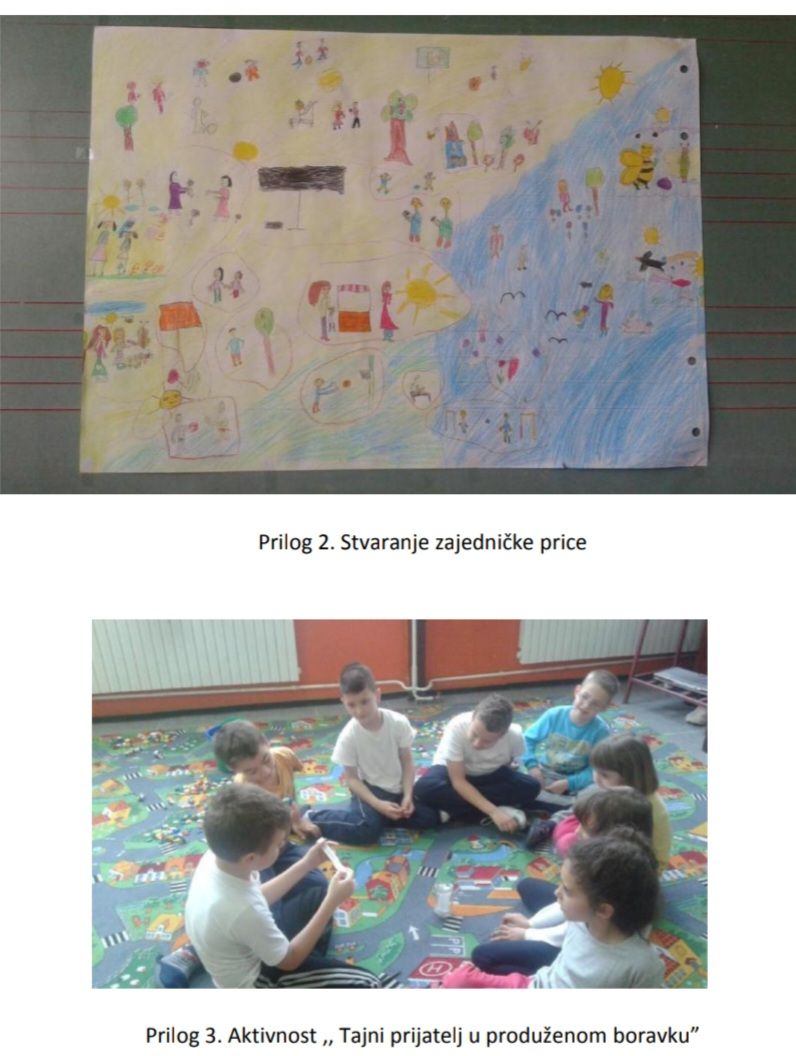 Nakon što su završili sa crtanjem, ponovo je svaki učenik izlazio pred tablu i bojao svoj crtež. Tako je nastao crtež na kojem su prikazane mnoge aktivnosti koje naš život čine ljepšim upravo zato što ih imamo sa kim podjeliti. Igra ,, Tajni prijatelj u produženom boravku“ doprinjela je još većem zbližavanju učenika. Svaki učenik se potpisao na jedan papirić a onda smo te papiriće stavili u teglu. Zatim je svaki učenik izvukao jedan papirić sa imenom učenika koji će biti njegov tajni prijatelj. Zadatak je bio učiniti jedno dobro djelo za učenika čije ime piše na papiriću koji je izvukao, ali na način da ne otkriju ko im je tajni prijatelj do zadnje radionice. Na zadnjoj radionici učenici su donijeli nešto što su sami izradili za svog tajnog prijatelja. Bilo je tu raznih čestitki, pisama, crteža, slatkiša pa čak i životinja napravljenih od kartona.