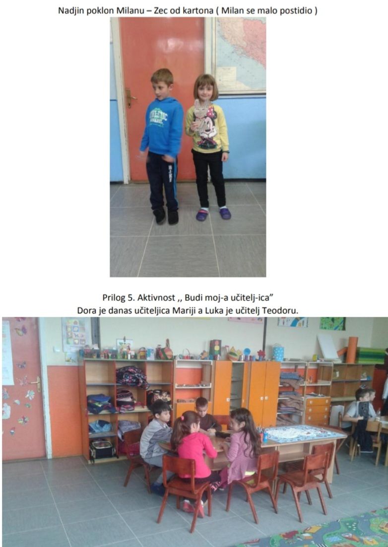 Već nekoliko sedmica ne primjećujem da iko od mojih učenika zadirkuje ili ismijava svoje mlađe drugare već nastoje da ih i oni sami nečemu nauče. Oduševljena sam atmosferom koja je postignuta u produženom boravku. Svi učenici se više poštuju i uvažavaju. Od svih aktivnosti koje sam provela primjetila sam da im se najviše svidjela aktivnost ,, Budi moj učitelj/ica “ koju sam sama osmislila a ona je ujedno dala i najbolje rezultate. Svojim najvećim uspjehom smatram to što sada učenici sami traže da provode ovu aktivnost, koju su shvatili kao igru, tako da im je ja više ne moram ni zadavati. Shvatila sam takodje da je veoma korisno uvesti neke promjene u načinu rada jer se tako povećava i zainteresovanost učenika.