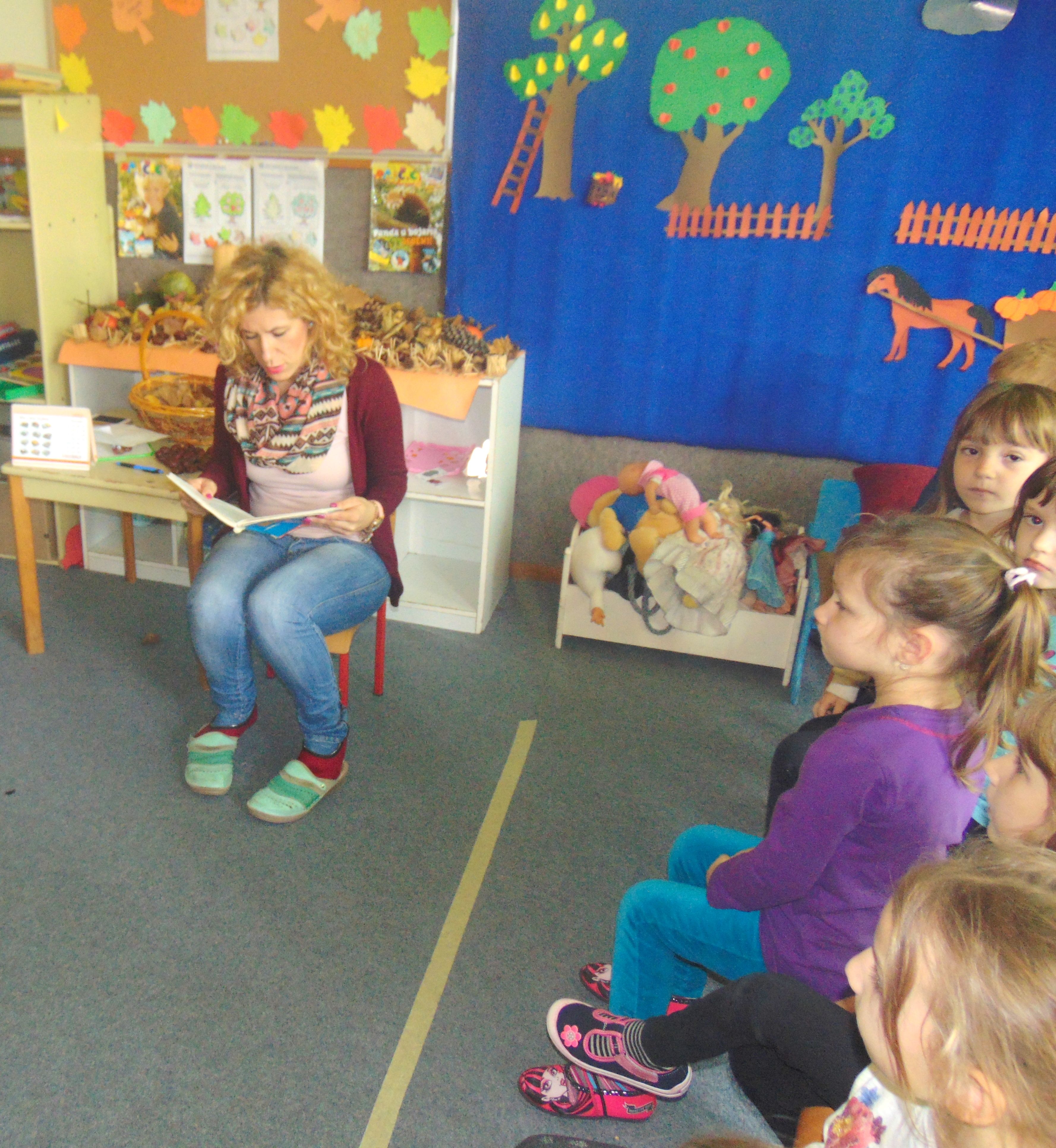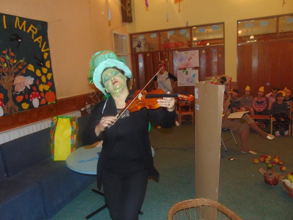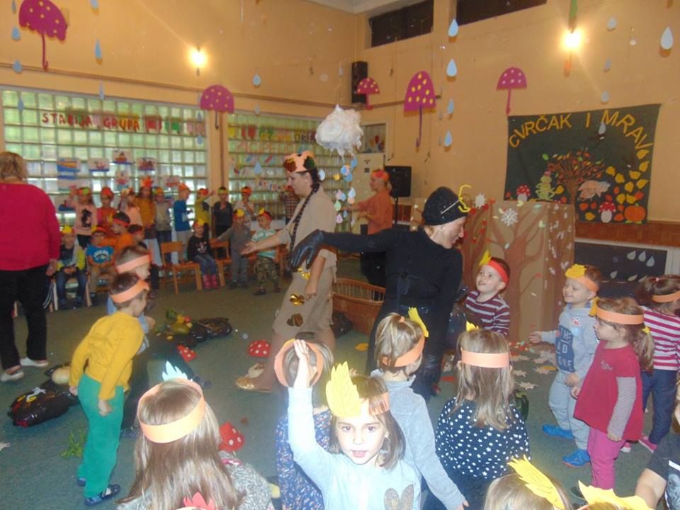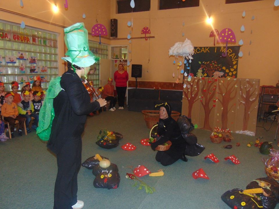 U ovom mjesecu koristili smo zvuk jeseni, šuškanje lišća, fijukanje vjetra, kapi kiše kao glavnu podlogu za planiranje predstave. Postepeno smo uvodili zimske elemente, te učili o osnovnim karakteristikama jeseni i zime, te vremenskim promjenama koje dolaze. Cilj je bio naučiti da osluškuju zvukove prirode, snalaženje i orjentaciju u vremenu i prostoru, te probuditi sva čula kako bi bolje poimali prirodu i ljepotu. Time smo pobudili svijest kod djece o zaštiti prirode i okoliša.Trudili smo se koristiti prirodne stvari i recikilirane materijale (oguljinu od kukuruza-komušina, lišće, kesten, šišarike, stari papir, novinski papir) pri kreiranju kostima i scene za planiranu predstavu.Glavni cilj nam je bio naučiti djecu o važnosti očuvanja okoliša i zaštiti prirode, i da sve što želimo napraviti za našu predstavu, sve nam je na dohvat ruke i uz malu spretnost recikliranja možemo sve pretvoriti u scenografiju.