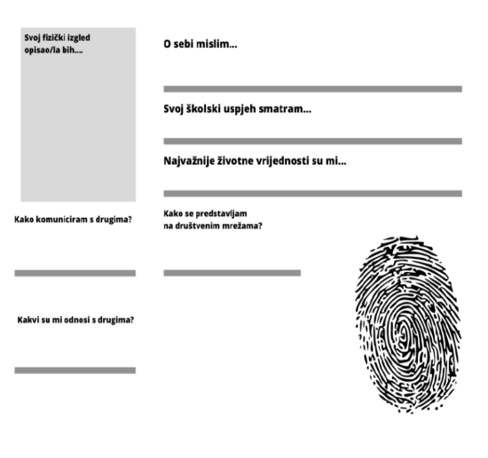 Aktivnost se može prilagoditi tako da učenici dobiju radni list (predložak u nastavku) i da sebe opisuju i predstavljaju na sljedeći način: