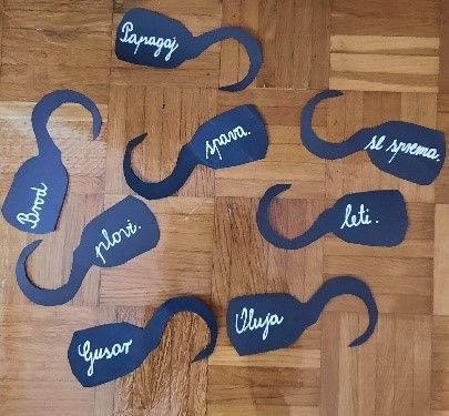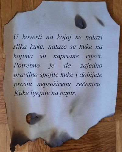 U koverti na kojoj se nalazi slika kuke, nalaze se kuke na kojima su napisane riječi. Potrebno je da zajedno pravilno spojite kuke i dobijete prostu neproširenu rečenicu. Kuke lijepite na papir.