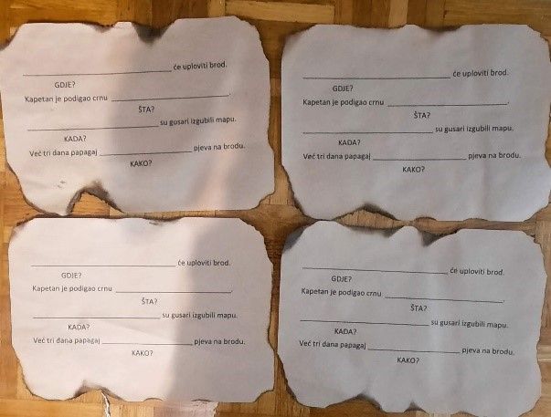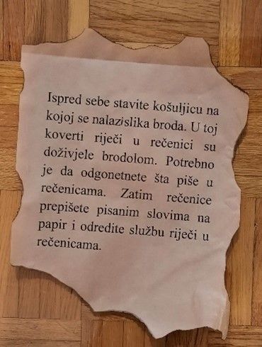 Ispred sebe stavite košuljicu na kojoj se nalaz slika broda. U toj koverti riječi u rečenici su doživjeli brodolom. Potrebno je da odgonetnete šta piše u rečenicama. Zatim rečenice prepišete pisanim slovima na papir i odredite službu riječi u rečenicama.