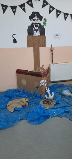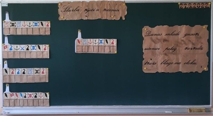 Učenici koristeći gusarski kod pronalaze gdje se nalazi blago. Učenik koji da prvi tačan odgovor, odlazi do ormara lagano otvara ormar iz kojeg ispada kostur od kartona, crni baloni i pronalazi blago. Blago otvara na učiteljicinom stolu. Dijeli (čokoladne) zlatnike drugarima i prisutnima.