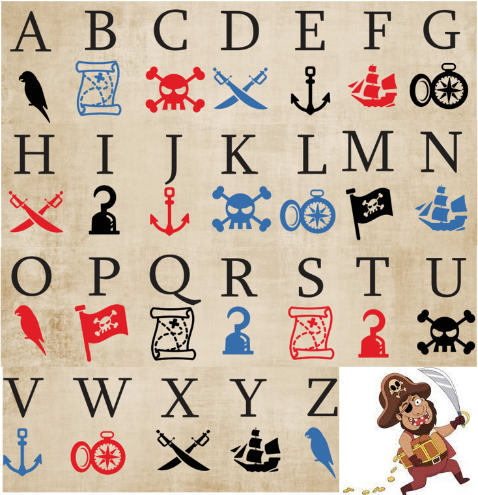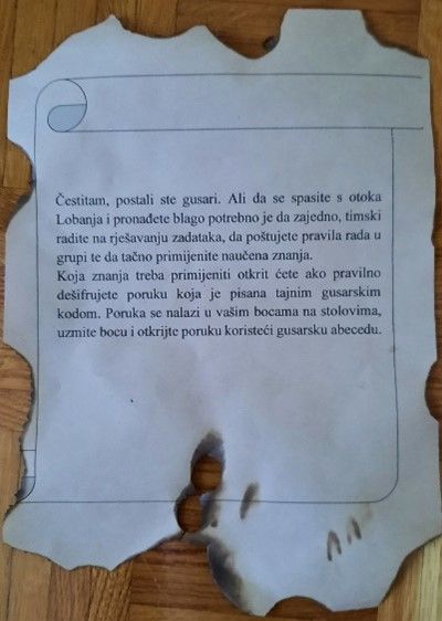Koja znanja treba primijeniti otkrit ćete ako pravilno dešifrujete poruku koja je pisana tajnim gusarskim kodom. Poruka se nalazi u vašim bocama na stolovima, uzmite bocu i otkrijte poruku koristeći gusarsku abecedu.