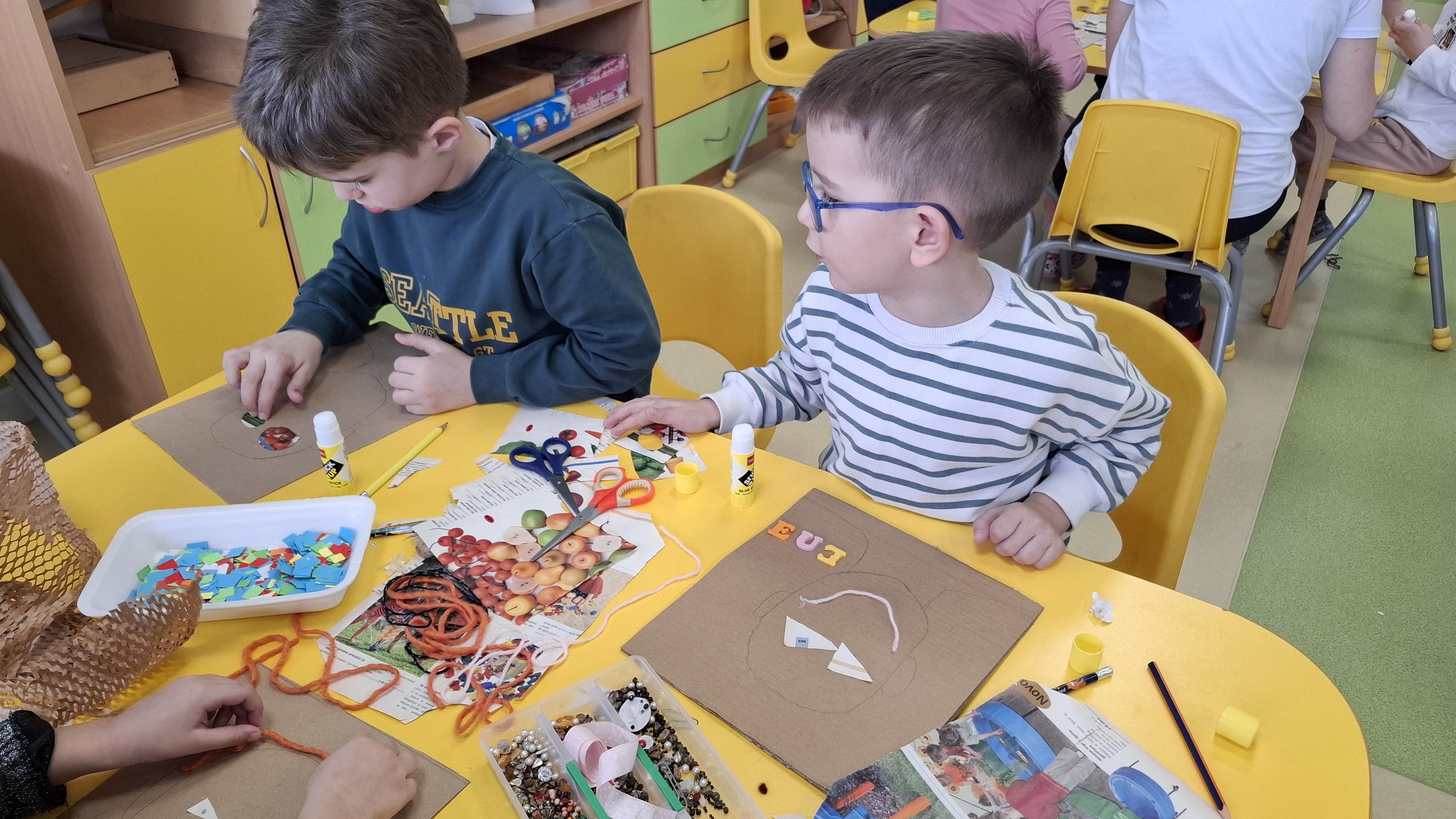 - Kartonske podloge, ljepilo, flomastere, perlice, vunicu, ukrasni papir, platno, makaze