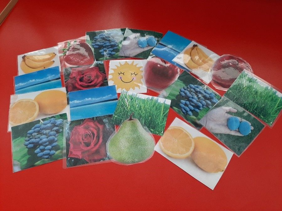 Vaspitač izgovara tekst: „Sve na svijetu ima svoju boju, a priroda kaže koju! Sve je oko nas šareno, pokažite mi drugari ko ima ispred sebe nešto crveno? Djeca ispred kojih se nalaze crvena jabuka, ruža i sl. podižu svoje sličice, imenuju šta je na slici i koje je to boje. Zatim vaspitač izgovara tekst: „Kažite mi sada pravo, šta ispred sebe imate plavo? Djeca ispred kojih se nalazi plavo grožđe, nebo i sl. podižu sličice i imenuju šta je na slici i koje je boje. Potom vaspitač izgovara: „Nešto može biti slatko, kiselo ili ljuto! Pokažite drugari ko ispred sebe ima nešto žuto? Djeca ispred kojih se nalazi limun, banana i sl. podižu sličice i imenuju šta je na slici i koje je boje. „Na početku smo rekli da je oko nas sve šareno, pokažite mi sad ko ispred sebe ima nešto zeleno?“ Na isti način djeca imenuju slike na kojima je prikazano ono što je zeleno, na primjer trava, kruška i sl.