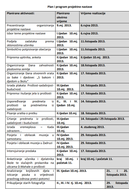 Na Satu razredne nastave, učiteljica je učenicima predstavila NPP za 4. razred. Učenici su uvidom u sadržaj izabrali područje svog interesa – prošlost užeg zavičaja. Na satu Hrvatskog jezika je realizirana aktivnost „Parlaonica“ na kojoj su učenici, uz vodstvo učiteljice, definirali naziv projektne nastave: Učimo o prošlosti da bi nam bilo bolje u budućnosti.